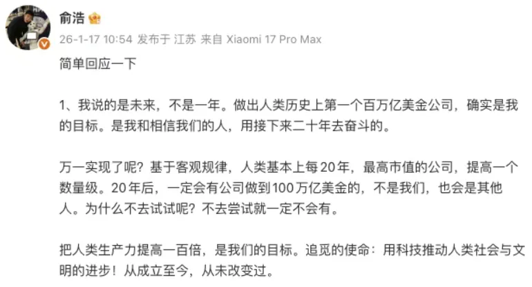 追觅科技的创始人俞浩,近期在朋友圈和社媒提及到一个看似违背常识的目标:他要将公司做到“百万亿美元”的市值。