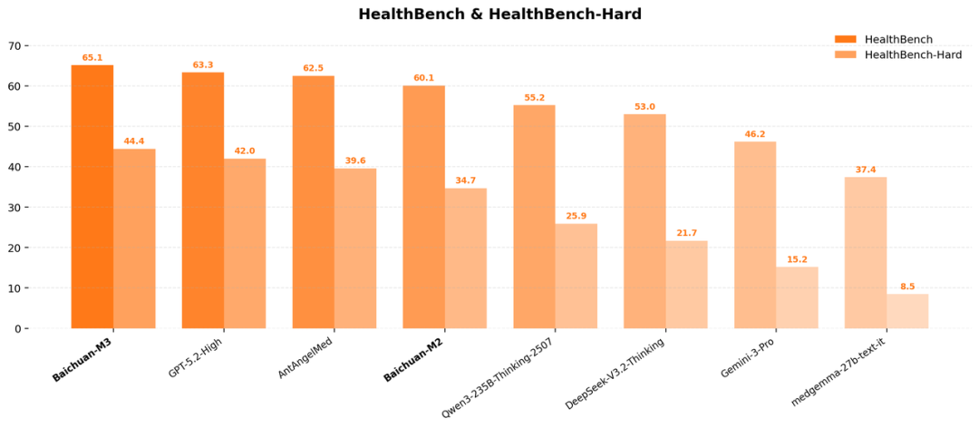 就在1月13日,百川智能正式开源新一代医疗大模型Baichuan-M3。据介绍,Baichuan-M3在全球最权威的医疗 AI 评测 HealthBench 中以 65.1 分的综合成绩位列全球第一;在专门考验复杂决策能力的 HealthBench Hard 上,也以44.4分的成绩夺冠。