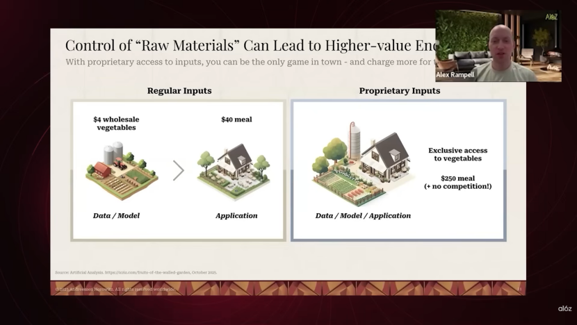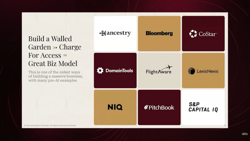 在这种环境下,应用层公司的生存蓝图在于掌握稀缺的原材料——数据。这就像是世界上最古老的商业模式:圈一块地,建立实体资产,然后对访问者收费。在AI时代,你可以通过数据做同样的事情。