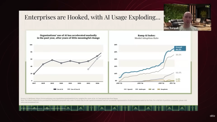 a16z认为人性底层的逻辑非常简单:每个人都想要两样东西:变得更富和变得更懒。对于企业来说,采用AI不仅仅是为了降本(更懒),更是为了直接创造营收(更富)。从Ramp的数据来看,企业在AI上的支出在2025年1月出现了一次巨大的跃升。这是实打实的生产力落地。