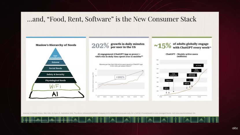 马斯洛需求层次理论的底层曾被戏称为Wi-Fi,而现在出现的下一个需求底层实际上是AI。美国约有15%的成年人每周使用ChatGPT,它已成为日常工具——从解决生活琐事(比如我妻子用它查询法律条款来处理校车投诉)到处理复杂的商业逻辑。