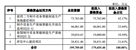 而惠康科技此次IPO欲募集17.97亿元分别用于前湾二号制冷设备智能制造生产基地建设项目、制冷设备生产基地智能化升级改造项目、泰国制冷设备智能制造生产基地项目、研发中心建设项目,具体情况如下: