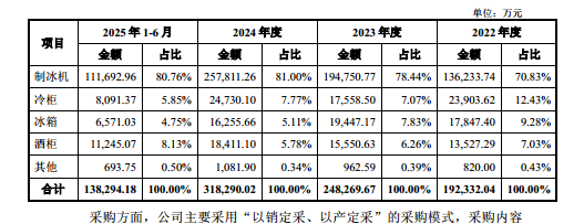 值得关注的是,制冰机销售单价呈持续下滑态势,报告期内分别为435.22元/台、403.97元/台、385.9元/台、365.76元/台,2025年上半年较2022年累计下滑18.99%。