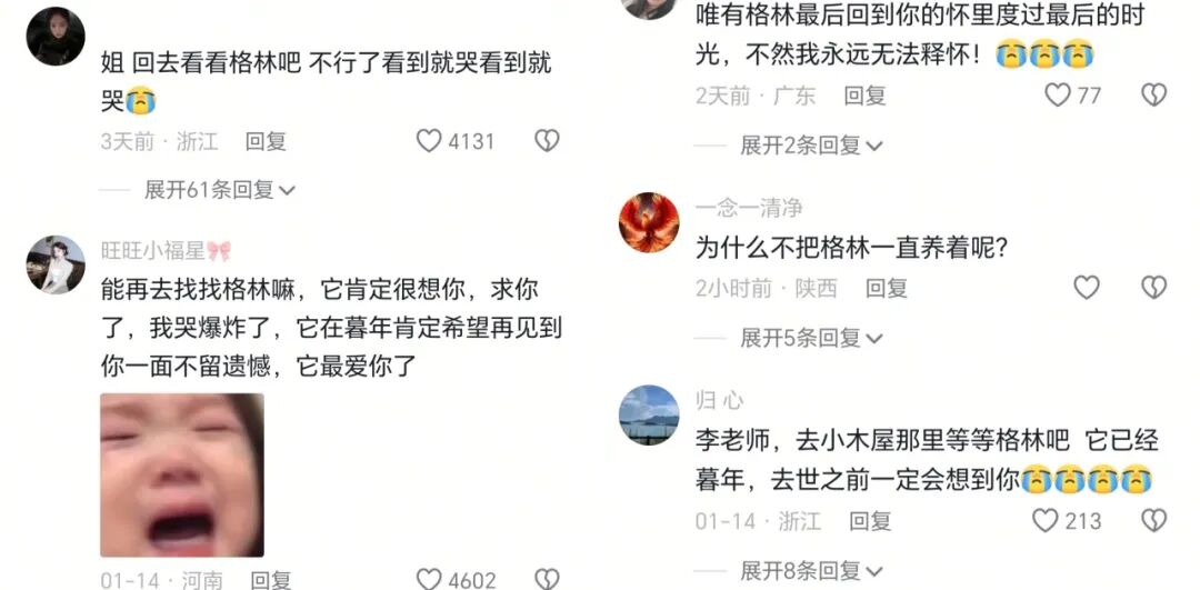 随着传播的深入,大众的注意力从单纯的故事讨论,逐渐转向故事背后的现实议题。网友纷纷在社交平台追问格林的近况,担忧其生存状态,李微漪2021年后就已经在社交平台停更格林相关内容,如今社交账号评论区则被无数关心与问候的留言填满。