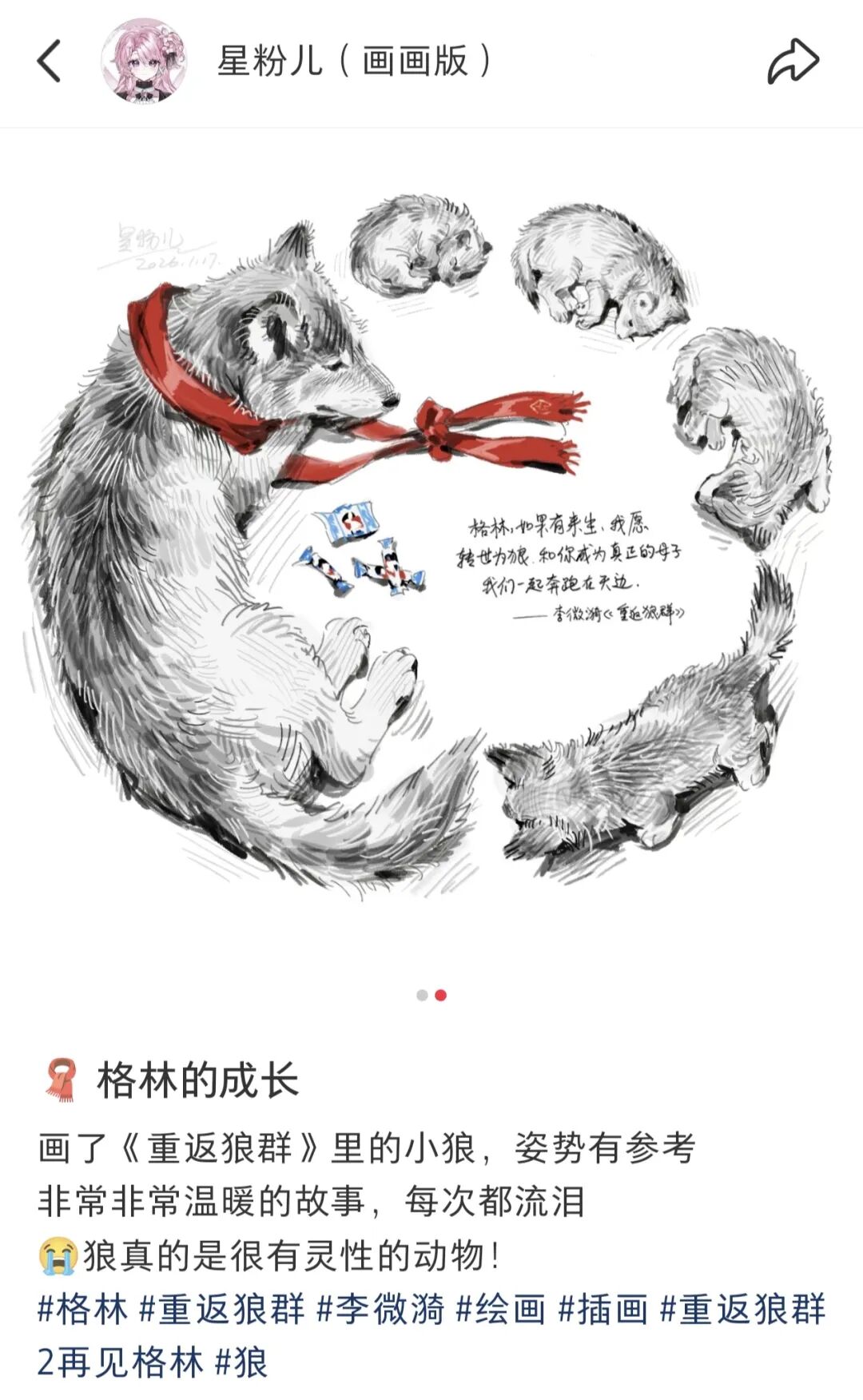 《重返狼群》记录了野生动物画家李微漪救助并成功将小狼「格林」送归草原狼群的真实经历,该片原型故事曾于2012年以书籍形式出版并受到关注,后又被李微漪和彼时的伴侣亦风用镜头记录下来,2017年纪录片《重返狼群》上映,而将近十年后,这些珍贵片段通过短视频重新进入公众视野。