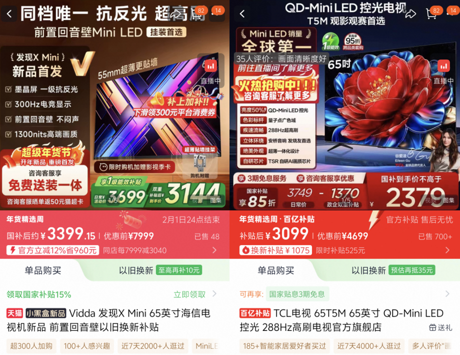 在格局剧变的进程中,国补又给了临门一脚。在国内市场,叠加国补后,海信、TCL等品牌部分55英寸及65英寸型号的Mini LED 电视价格已下探至3000元以下的主销价格段,Mini LED 的「技术下放」近一步加快。