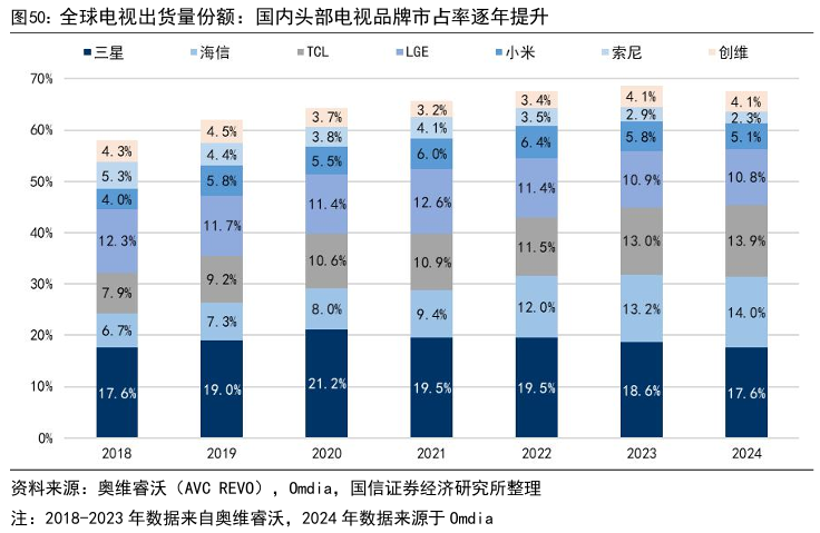 2024年,中国品牌电视的全球出货量首次超越韩国;不仅如此,TCL和海信在中高端电视市场有了更大声响——以75英寸以上大屏电视为例,两家在全球市场的份额已从2020年的5.1%和4.2%,攀升至2024年的15%与14.6%。