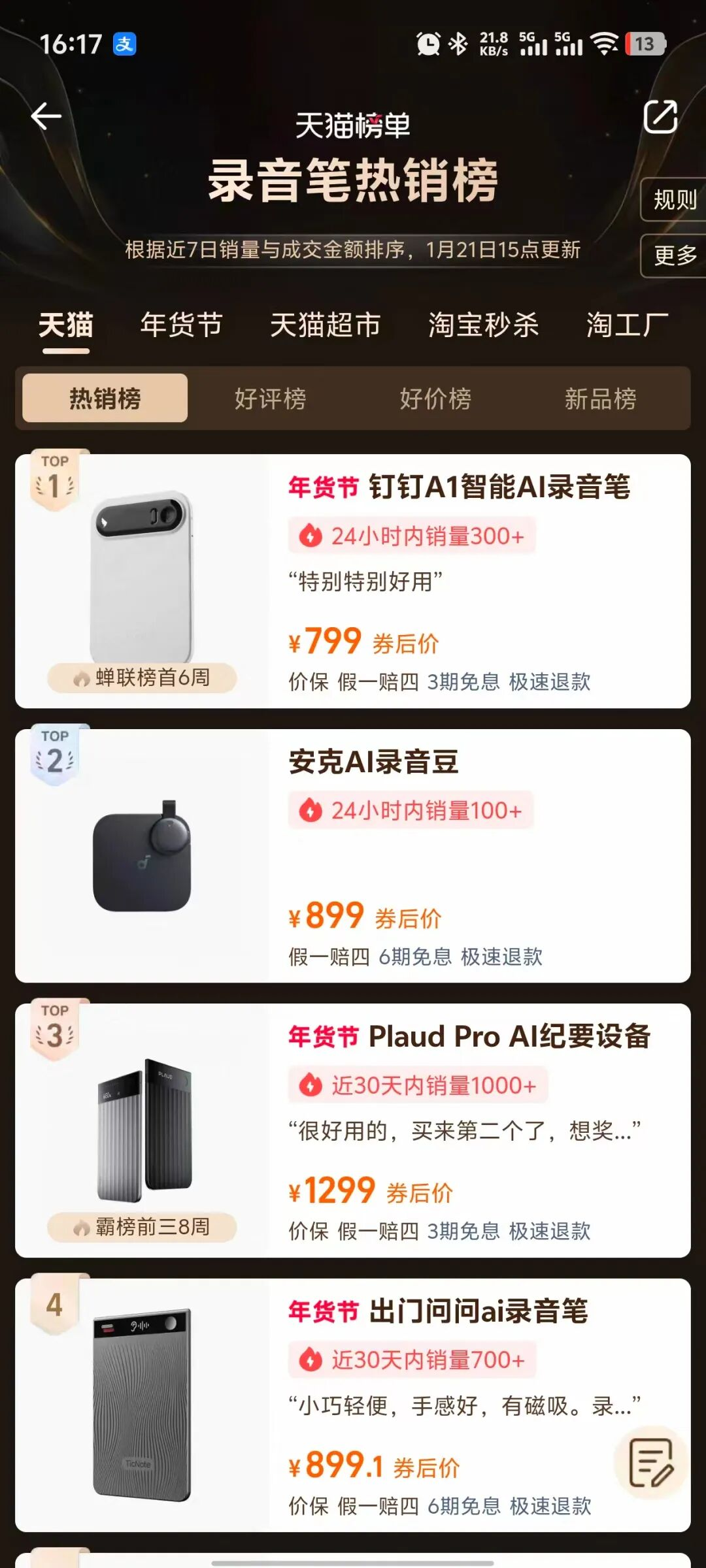 在天猫录音笔热卖榜上,销量前三名是钉钉 A1、安克 AI 录音豆和 Plaud Pro,其中钉钉 A1 过去 24 小时的销量数据是 300 多台。