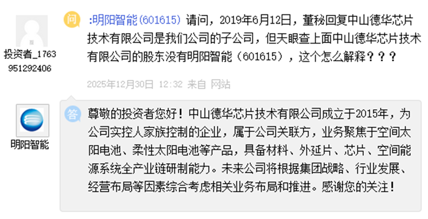 当时明阳智能回复称:“中山德华芯片技术有限公司成立于2015年,为公司实控人家族控制的企业,属于公司关联方,业务聚焦于空间太阳电池、柔性太阳电池等产品,具备材料、外延片、芯片、空间能源系统全产业链研制能力。未来公司将根据集团战略、行业发展、经营布局等因素综合考虑相关业务布局和推进。”