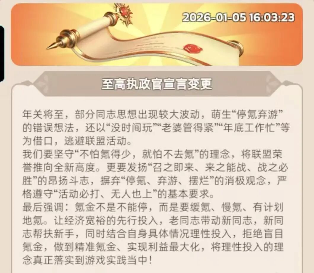 玩家梦灵则坦言,自己只是因为上班太闲了玩《无尽冬日》,“为数不多能在手机上摸鱼玩的,小程序一拉一划很方便”,她对战力没什么追求,对战斗结果也不看重,可就是因为联盟军师太努力,“天天在群里发公告发提醒,谁有困难他都帮,替别人上号做日常,所以我觉得我平时摆就算了,国战不好好打对不起他。”