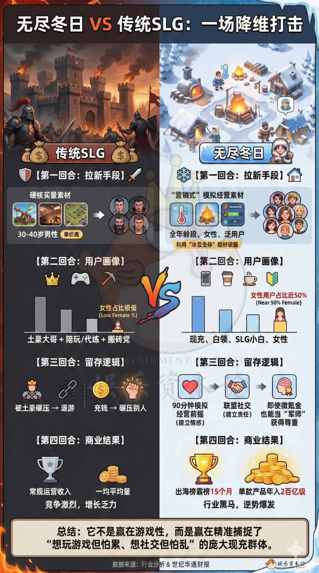 说到底,《无尽冬日》的成功,并不在于它做了一款多么“颠覆式”的 SLG,而在于它精准抓住了一批过去被忽视的玩家:被广告骗进来的现充人、愿意当“国师”的指挥、在联盟里找到归属感的普通上班族,以及在游戏里难得被当成中坚力量、不是“女玩家”标签化的女性管理者。他们共同撑起了这款游戏的流水,也撑起了点点互动乃至世纪华通这几年的翻盘曲线。