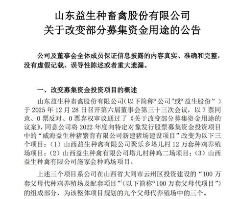 2025年底,益生股份发布公告称,拟将2022年定增募集资金中原计划用于种猪项目的1.89亿元,转投至山西大同的三个父母代种鸡养殖场项目。