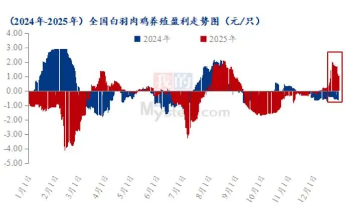 随后,价格并未沿着单一方向继续上行,而是重新回到震荡区间。直到11月末,随着前期供给收缩效应进一步传导,白羽鸡价格再次启动一轮持续拉涨,并在12月刷新年内高点,部分区域甚至出现加工端集中抢鸡的情况。