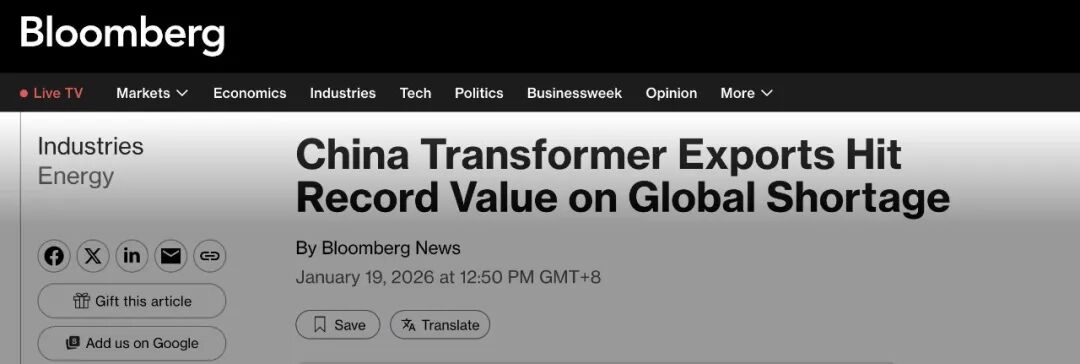 据中国海关总署在 1 月 18 日公布的数据,去年中国变压器出口额达到创纪录的646亿元人民币,同比增长近36%,达到了历史新高;工厂的订单已经排到 2026 年之后,需求极其旺盛。