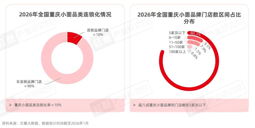 与面馆大赛道相似,重庆小面赛道当前仍以夫妻店、街边摊为主,连锁化水平和品牌规模化程度整体偏低。红餐大数据显示,截至2026年1月,重庆小面品类连锁化率不足10%。其中,80.3%的品牌门店数在5家及以下,而门店数在100家以上的品牌数占比仅为0.8%。