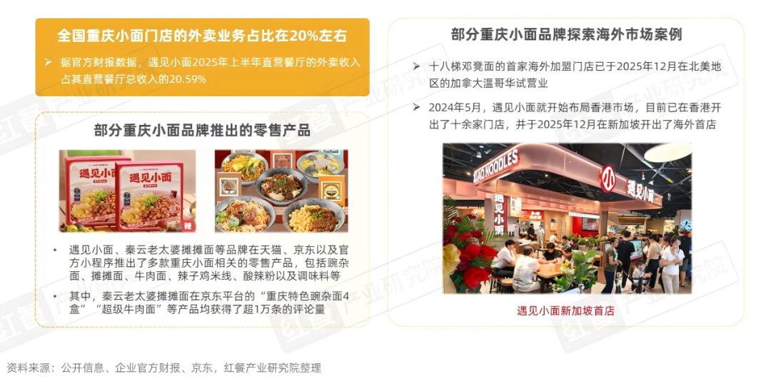 在渠道建设方面,重庆小面品牌不仅深耕线下堂食和线上外卖两大核心渠道,还通过推出预包装产品积极拓展新零售业务,进一步拓宽品牌发展边界。例如,遇见小面、秦云老太婆摊摊面等品牌在其官方小程序和主流电商平台推出了零售产品。