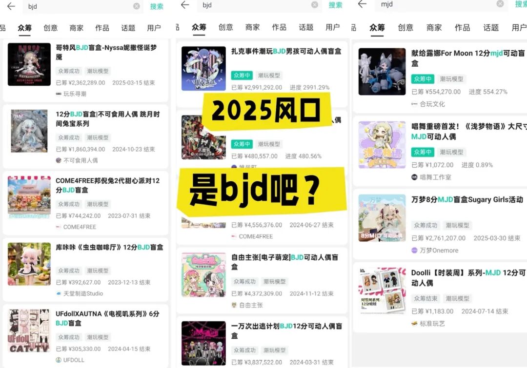 2024年、2025年,市场就爆出不下10个百万级可动人偶类众筹项目。初创团队众筹项目“糖指数100%”,很快就达成800万众筹额。有统计,赛道内不下50+工作室/品牌,既有成品销售,也有素体、素头这类部件定制类。
