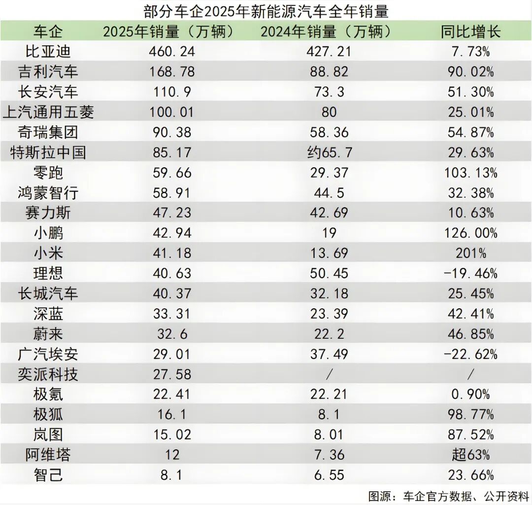 比亚迪遥遥领先,以460.24万辆的全年销量蝉联冠军,其中纯电车型销量225.7万辆,超越特斯拉成为全球纯电冠军。其高端品牌矩阵也表现亮眼:方程豹系列全年销量23.46万辆,同比暴涨316%,腾势品牌也持续收割高端市场份额。