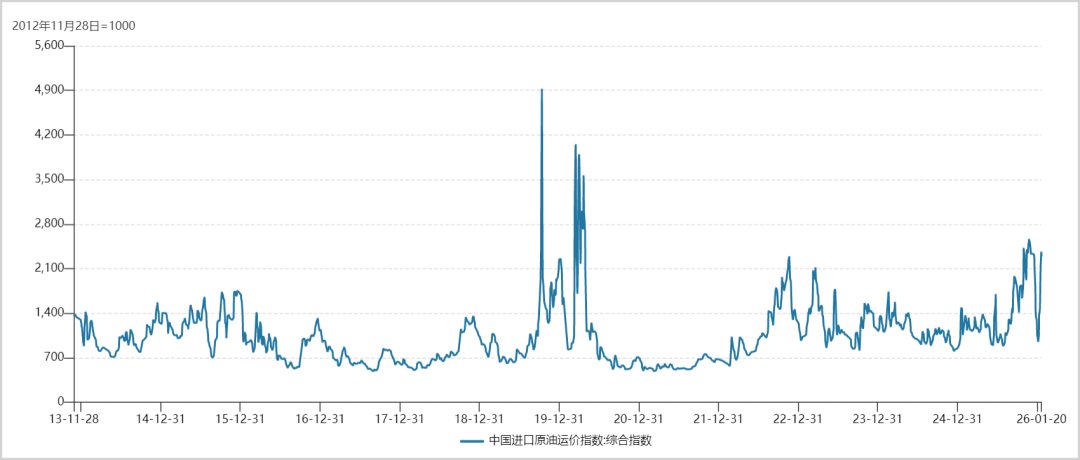 2025年7月底,中国进口原油运价指数触及880点的多年低位,随后市场呈现出“淡季不淡”的特征,并在传统旺季的四季度创下5年新高。此后虽有一定波折,但最新运价依然维持在相对高位。