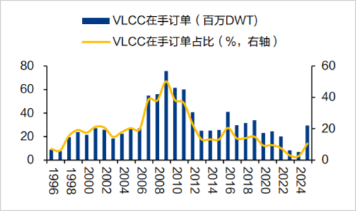 新船订单方面,截至2025年末,VLCC在手订单为2949万载重吨,占现有总运力的10.6%。由于2022-2023年新订单量已处于数十年低位,未来三年即便正常交付,新船交付也远低于以往平均水平。此外,目前主流船厂的船台多被集装箱船订单占据,油轮新订单普遍排至2028年后才能陆续交付。
