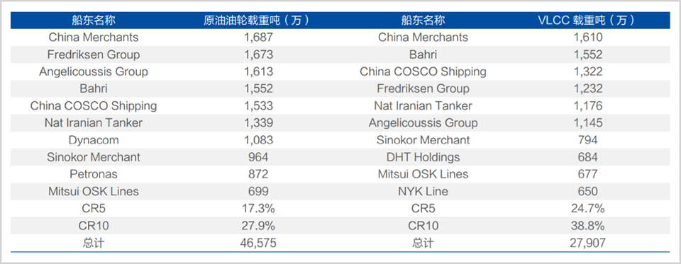 据克拉克森最新数据,按VLCC载重吨计算,招商轮船、中远海能分别以1610万吨和1322万吨位列全球第一、第三,前十家公司市场占有率合计已接近40%。