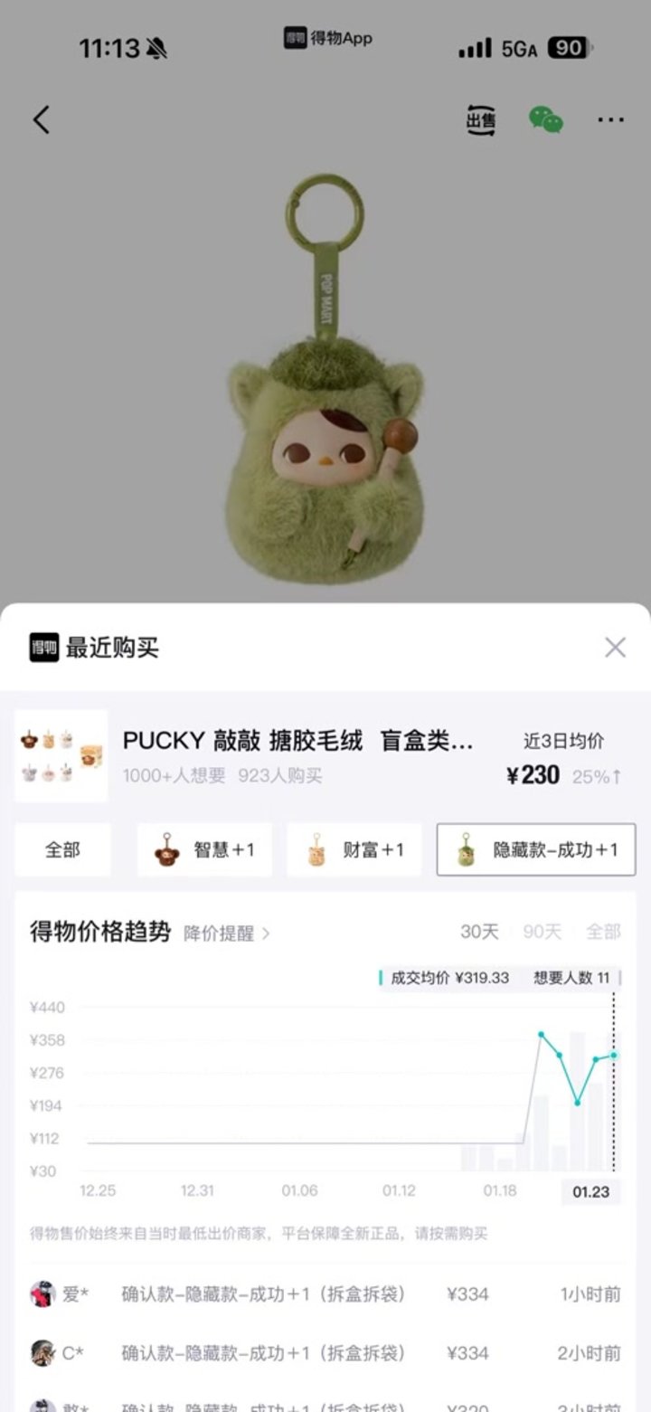 因受年轻人青睐,二手市场出现明显溢价。据得物App数据显示,该系列发售之初,隐藏款“成功”市场成交价由99元最高上涨至396元,溢价3倍。截至记者发稿,常规款中,智慧、财富受到追捧,该产品市场成交价由99元上涨至162元、169元。