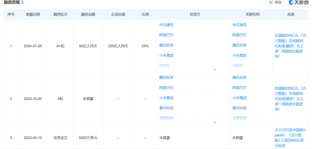 根据天眼查的信息,百川上一轮融资停在2024年7月,拿了50亿,估值200亿。之后就没再有公开的融资消息。