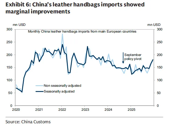 高盛的研究团队在实地走访中发现,近几个月来,国内主要高端购物中心SKP、万象城的奢侈品零售展现出了明显的恢复势头。从宏观海关数据中也能找到印证,来自欧洲主要国家的皮包进口量在近期出现了显著的环比增长,这种边际改善直接反映了高净值人群的信心回归。