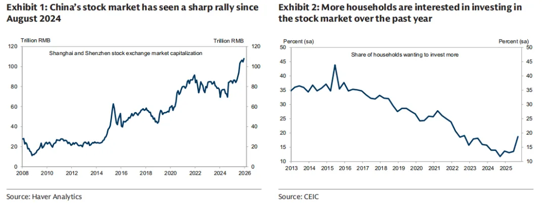 这种体感在宏观数据上也得到了印证。据高盛最新发布的报告显示,A股自2024年8月的低谷以来,截至去年年底,总市值已经累计上涨了55%。随着账户数字的跳动,居民的投资意愿也顺势爬升到了2022年第三季度以来的最高点。