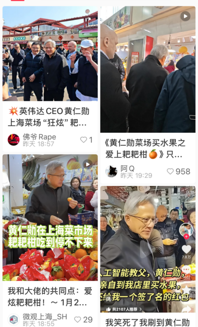 1月23日下午刚落地上海,黄仁勋先去张江的新办公室转了转,第二天下午直接“杀”到菜市场。