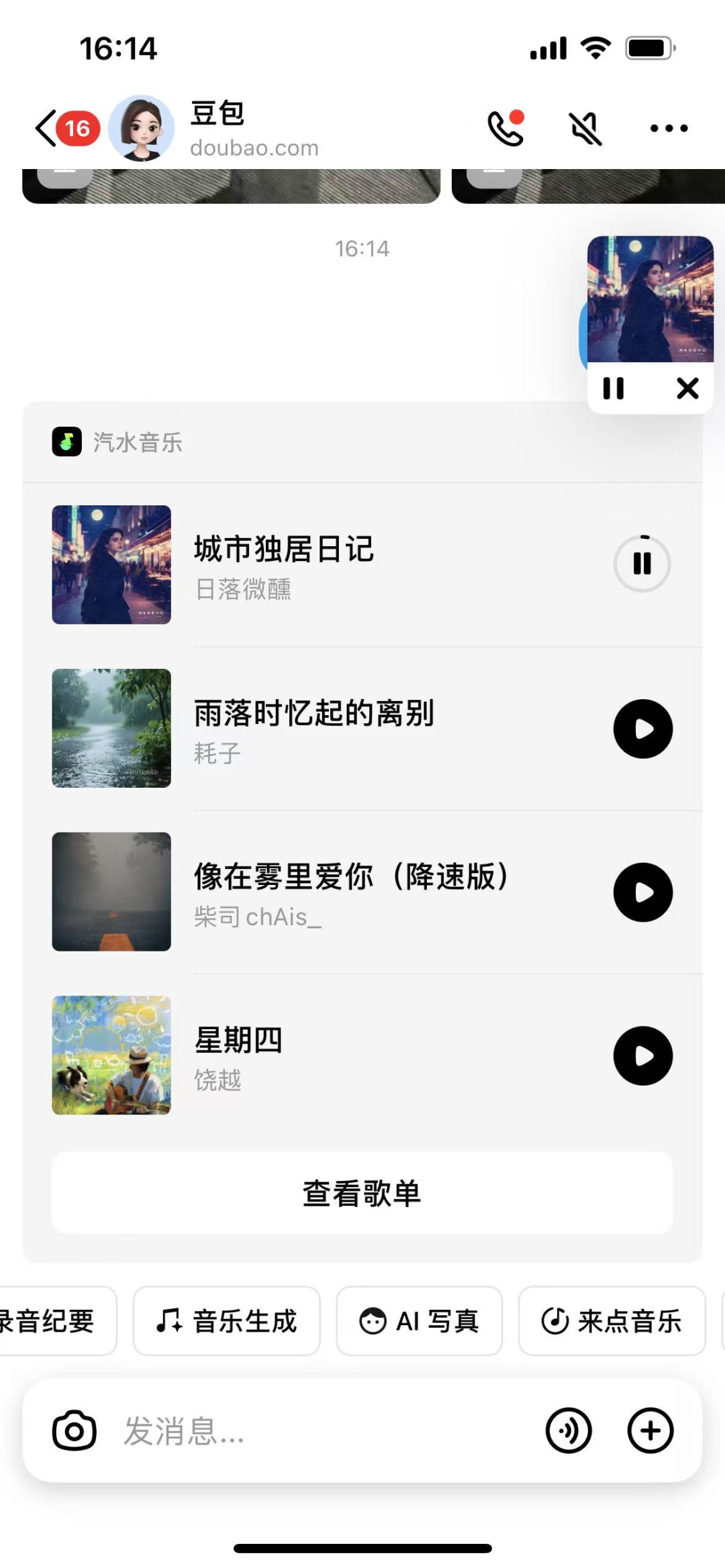 不过,AI对汽水音乐的赋能远不止于此。近日,不少用户发现在豆包的聊天主界面中新增了汽水音乐功能,用户只需点击“来点音乐”就能直接在豆包播放音乐、查看歌词等;用户也可以输入“播放周杰伦的歌”等提示词来调用汽水音乐卡片。