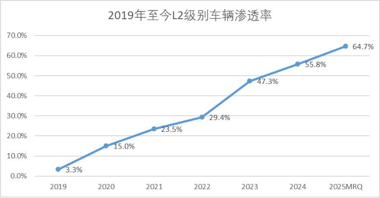 而当曾经豪华车配件下放成一种惯性时,消费者的阈值也在不断升高,自然会进一步带动部分零部件厂商的装机量和市占率。比如L2辅助驾驶,2025年前9个月的渗透率已经达到了65%左右,相对应的部分激光雷达、智能驾驶域控制器厂商也取得了不俗的增长。