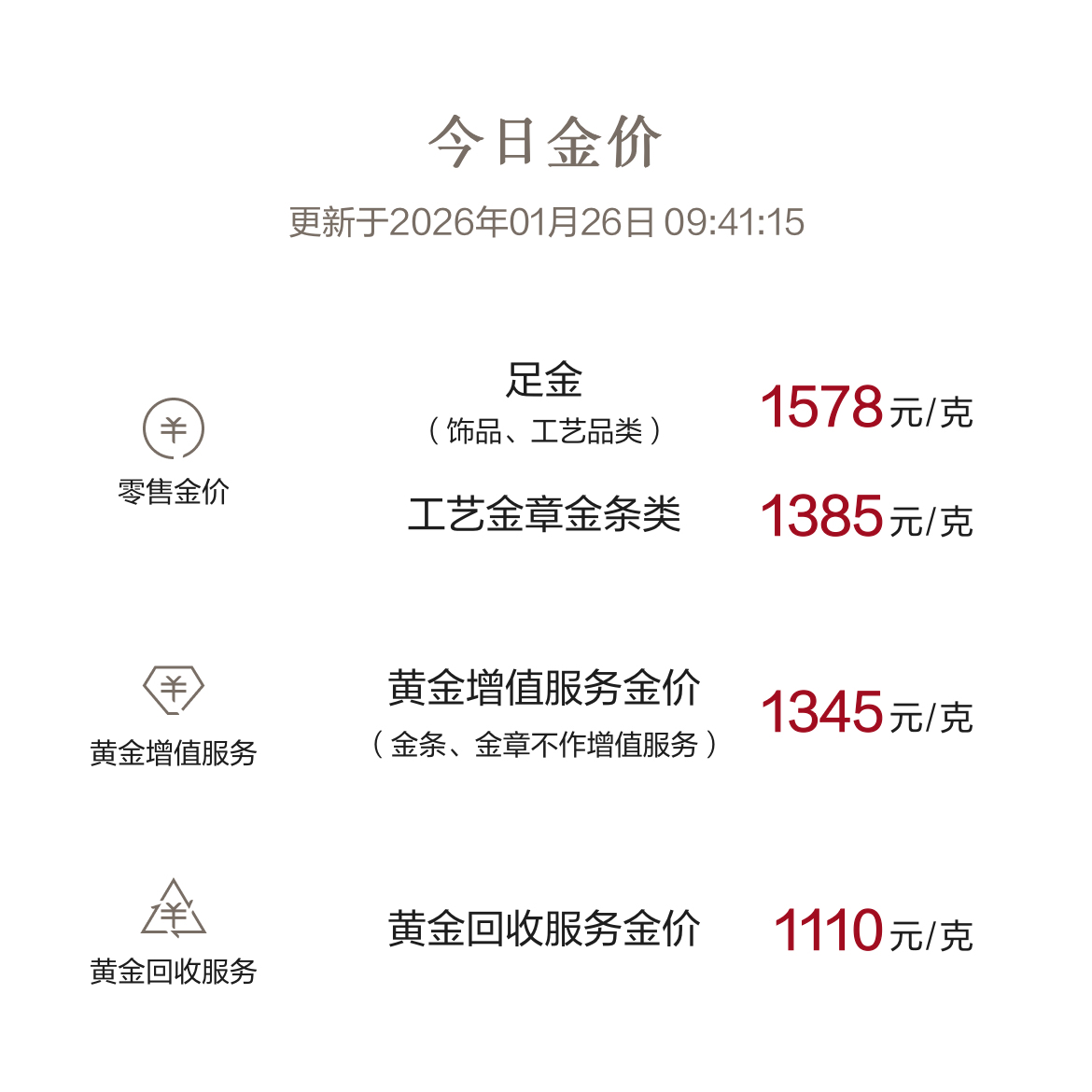国际金价的里程碑式突破,直接反映在国内黄金消费市场。1月26日,各大主流金饰品牌零售金价应声上调,单日涨幅显著。具体来看,周大福足金价格由1542元/克上涨至1578元/克;老庙黄金价格从1548元/克涨至1575元/克;周生生价格由1545元/克调整至1574元/克;潮宏基价格也从1542元/克升至1578元/克。各品牌每克金价普遍上调约30元。