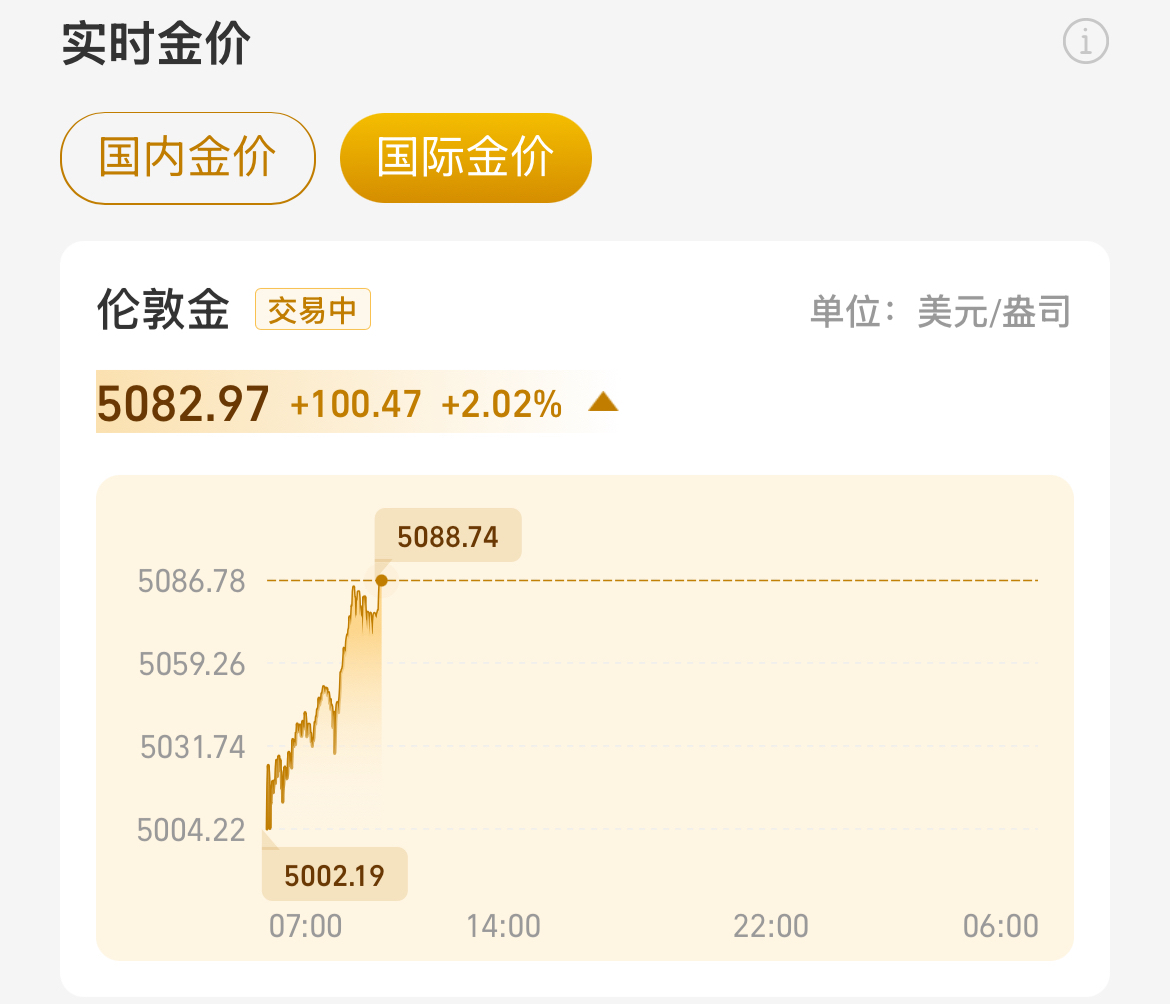 1月26日,现货黄金价格盘中直线拉升,史上首次突破每盎司5000美元心理大关,创出历史新高。截至发稿,金价报每盎司5082.97美元,日内涨幅达2.02%。