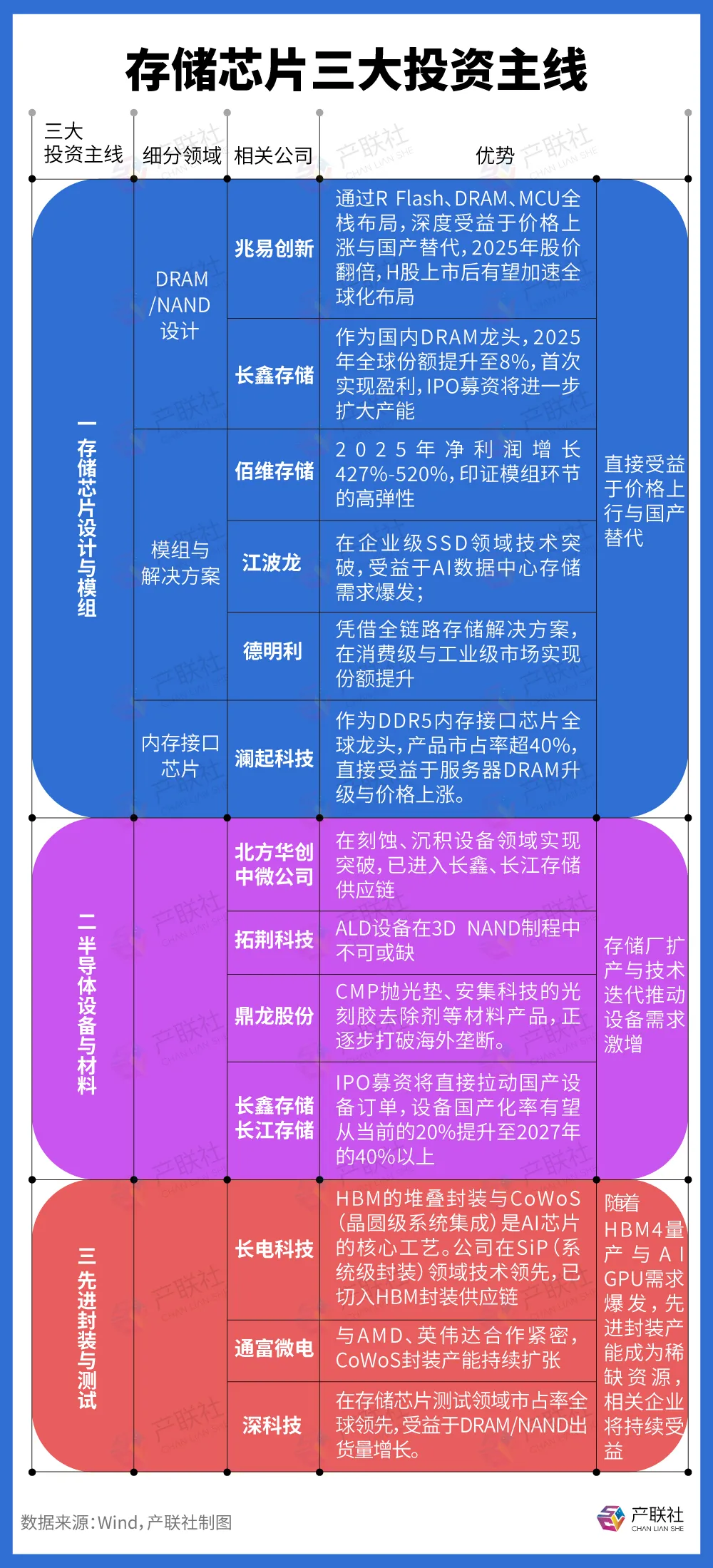 存储芯片“失控式上涨”背景下,产业链各环节均迎来历史性投资机遇,核心聚焦于设计与模组、设备与材料、先进封装三大主线。