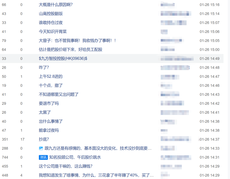 面对股价大跌,许多投资者也颇感疑惑,多位投资者在股吧发帖询问“出什么事情了”,也有投资者吐槽称,其此前通过其他股票半年赚了40%,买了九方智投后一天就跌完了。