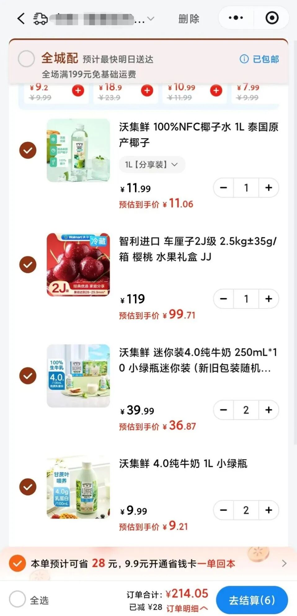 小花拿如今的购物经历举例,她家距离沃尔玛大卖场只有6公里,但只有偶尔才在线上的沃尔玛APP购买一些零食、牛奶,或者沃尔玛自营品牌的小吃,但同城配送需要满199元才能免运费,所以她下单前也要做好久的心理建设。