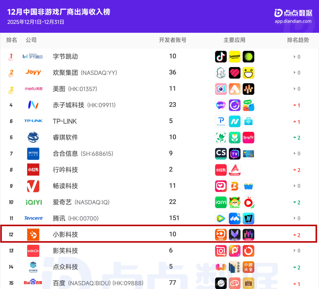 在点点数据近日发布的《2025年12月中国应用/游戏厂商出海收入Top30榜》中,小影科技再度维持了此前的数据升势,其12月海外收入环比提升近50%,排名已然稳居榜单前十五之列,且这一数据同比24年12月增长超过了147.1%。
