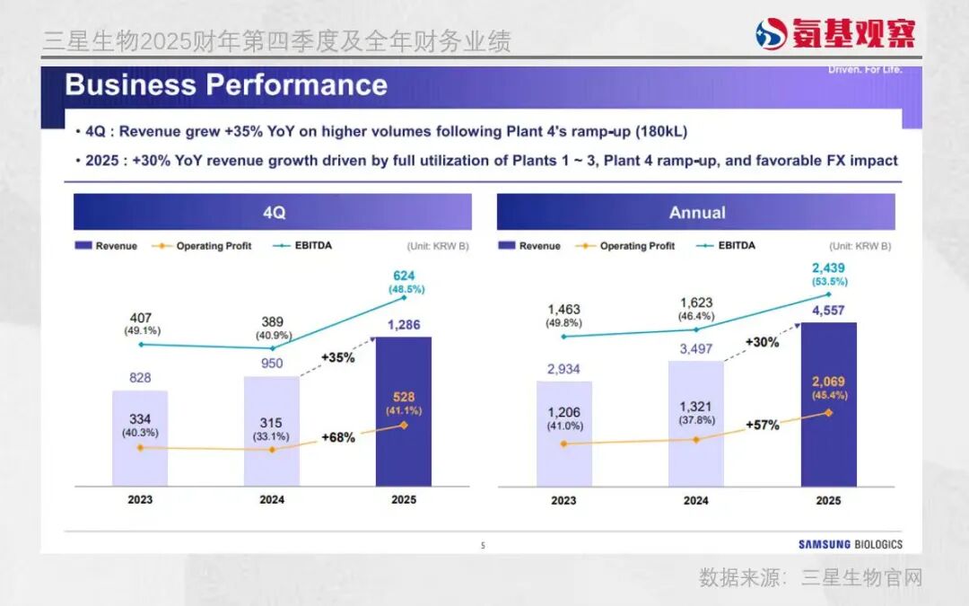 1月21日,三星生物公布了最新2025全年的财务业绩:营收45570亿韩元(约31亿美元),同比增长30.3%,营收利润额同比增长56.6%。
