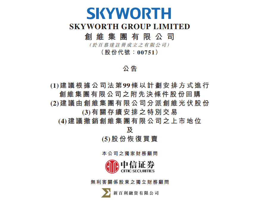 公告称,在满足分派条件的前提下,创维集团将向其全体股东分派创维集团所持有的创维光伏股份,并申请以介绍方式,让创维光伏股份在香港联交所上市。
