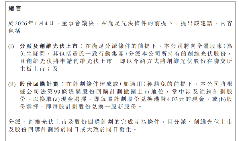 2026年刚开年,创维集团就开启了一场长达半个月的停牌。复牌前一天的1月20日,其终于对外宣布,将推进集团私有化退市,同时将向全体股东分派所持创维光伏股份,创维光伏将申请以介绍方式在联交所主板上市。