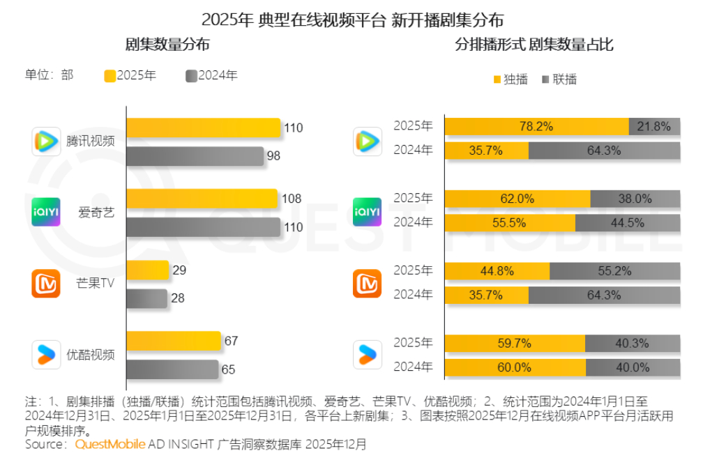 调研机构QuestMobile数据显示,腾讯视频、爱奇艺、优酷的播放量主要来自长剧集,长剧播放量占比超过83%;芒果TV则并重综艺和长剧,综艺播放量占比44.9%,长剧播放量占比33.9%;腾讯视频2025年上新110部,同比增加11.7%,其余各家2025年上新数量则基本与2024年持平。