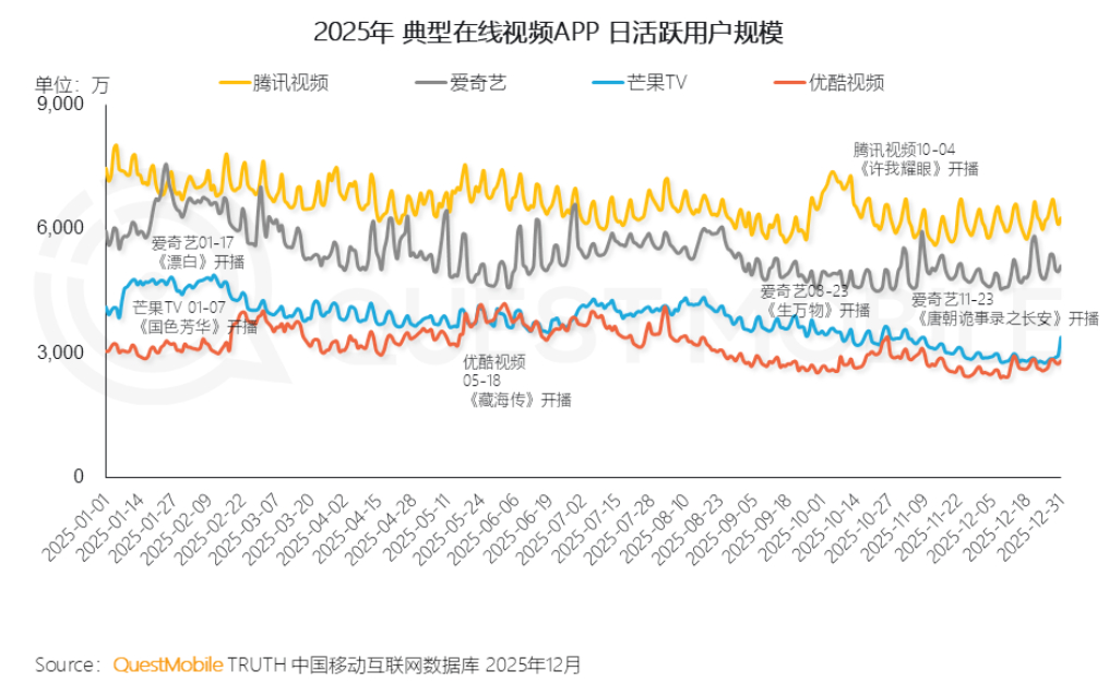平台高级别剧集上线时,往往能拉动数据形成峰值。QuestMobile数据显示,纵观2025年全年各长视频平台的DAU(日活跃用户)变化,高点往往出现在独播热剧上线时,比如优酷的峰值来自2025年5月上线的《藏海传》,腾讯视频的峰值来自2025年10月上线的《许我耀眼》,爱奇艺的峰值来自2025年1月时《漂白》的热播,芒果TV的峰值来自2025年1月开播的《国色芳华》。