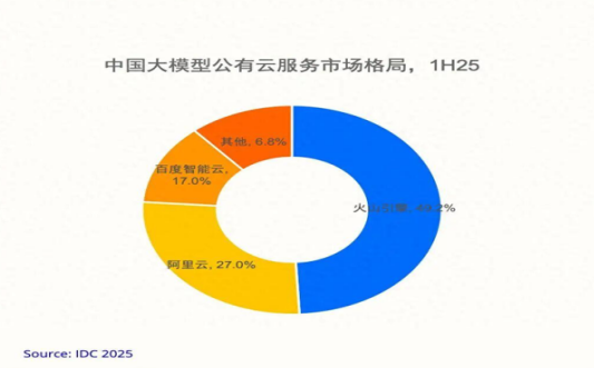 但如果把目光聚焦到MaaS细分市场,火山引擎的表现堪称“降维打击”。IDC数据显示,2025年上半年,火山引擎在大模型公有云服务调用市场的份额达到49.2%。