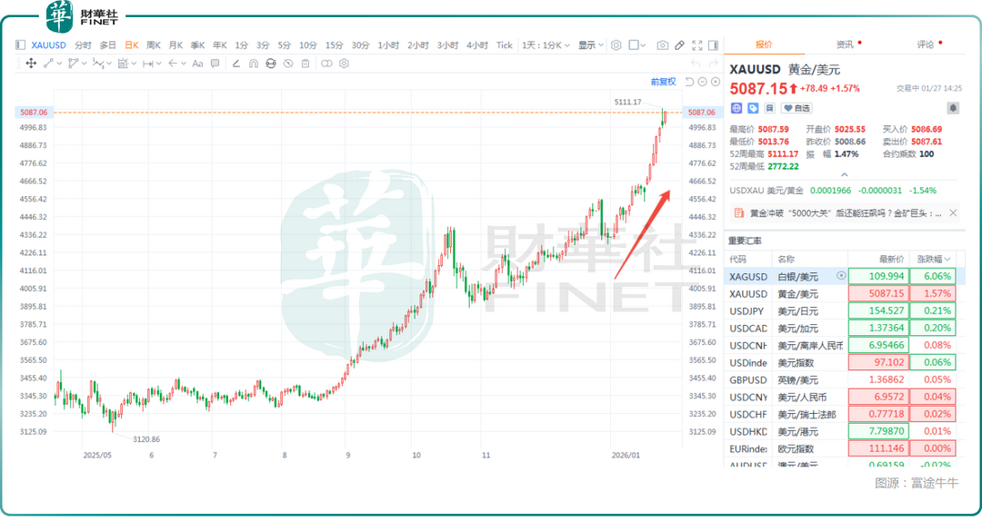 进入2026年,黄金的上涨之势未曾稍歇,金价还在一路攀升,并于1月26日历史首次突破5100美元的整数关口,但随后遭遇回落。而截至1月27日发稿时间,金价再涨近1.6%,现报5085美元/盎司,非常接近前一日创下的历史新高价位。
