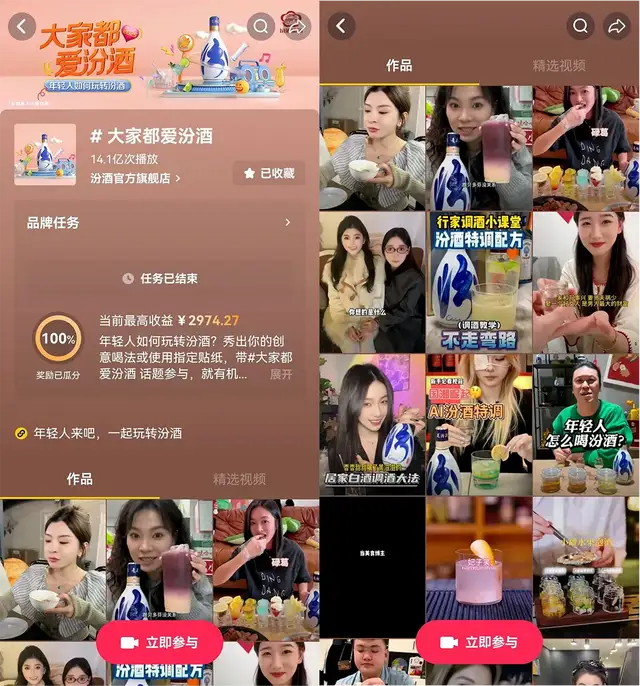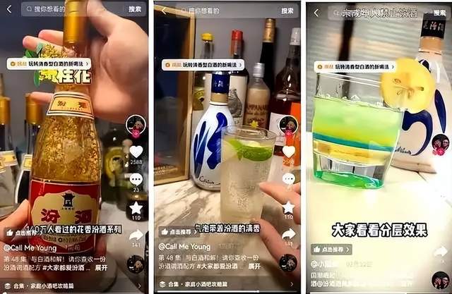 “大家都爱汾酒”抖音挑战赛吸引了大量年轻用户的参与,他们通过拍摄创意视频,展示自己对汾酒的喜爱和独特的饮酒方式,不乏可乐+汾酒、话梅+汾酒45ml+菠萝汁等神仙喝法。