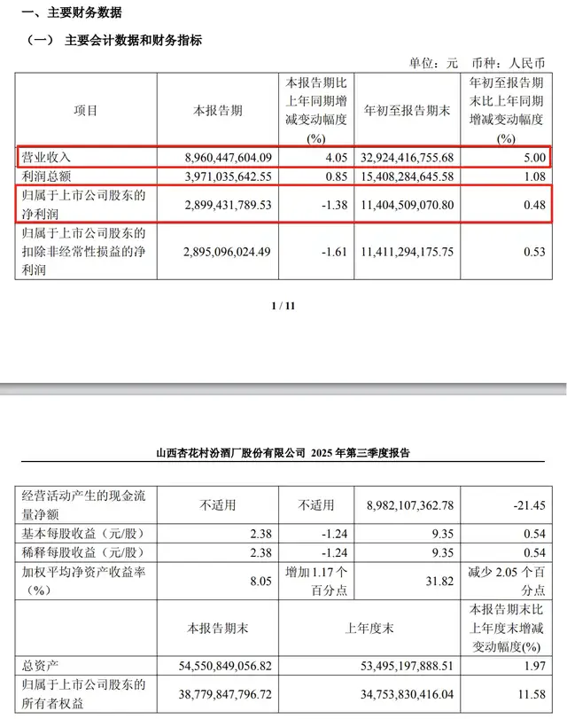 根据财报数据,2025年前三季度,山西汾酒实现营业总收入329.24亿元,同比增长5.0%;归母净利润114.05亿元,同比增长0.48%。
