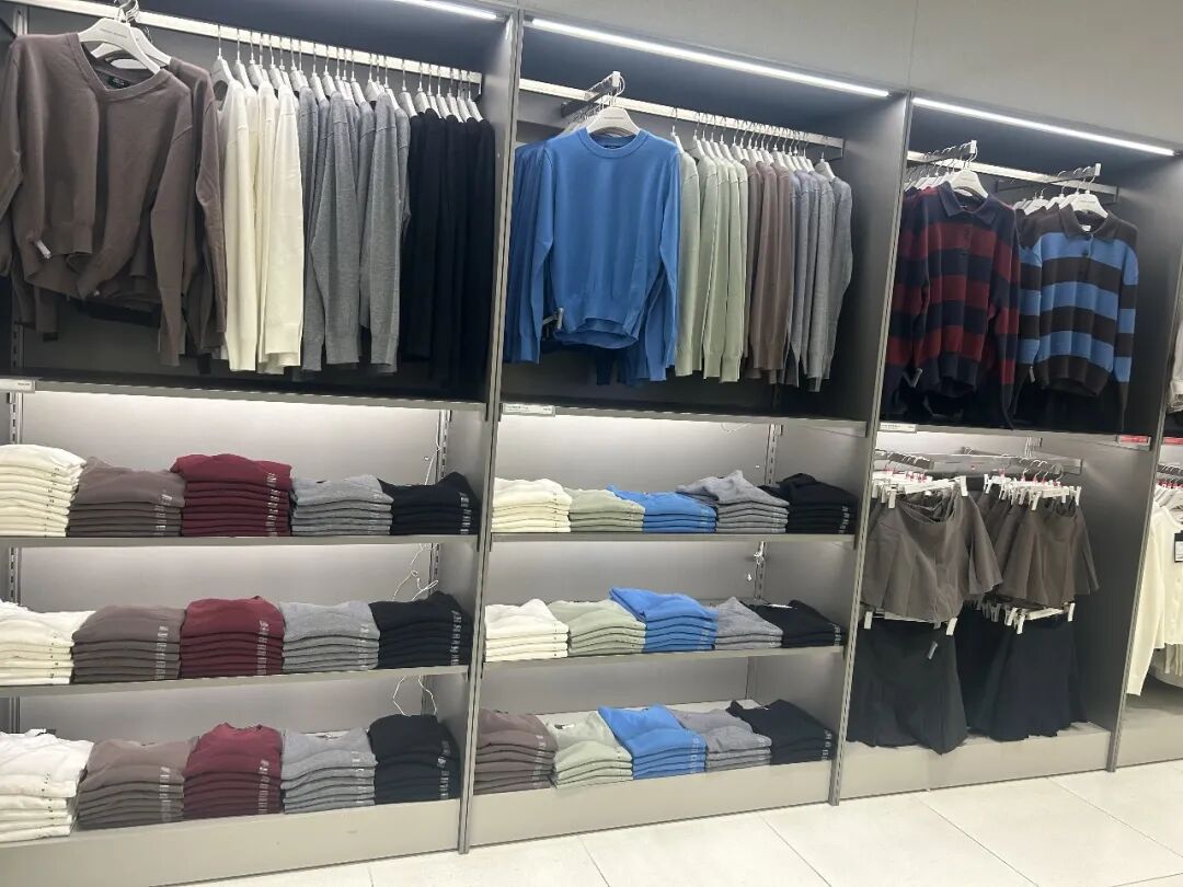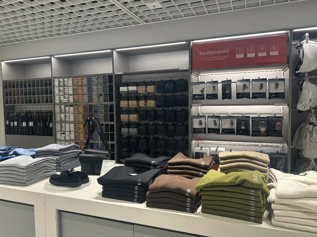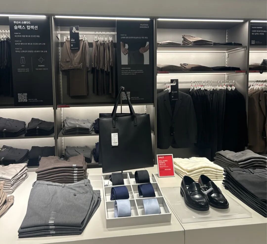 同样主打无logo基础款,优衣库的陈列更侧重功能性分类,设计更基础,而Musinsa则通过成套风格展示替代传统单品陈列,提升逛店效率,强调“韩女穿搭”的氛围感,简单却经得起多场景叠穿。