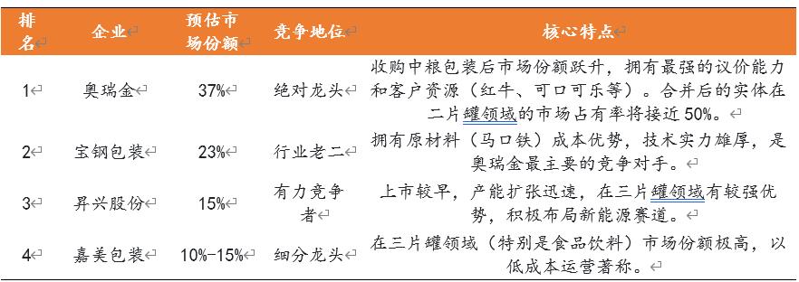奥瑞金以60.66亿港元(约合人民币55.24亿元)的现金对价,完成了对香港上市公司中粮包装100%股权的并购。此次并购完成后,奥瑞金在国内金属包装市场的预估份额攀升至37%,行业竞争格局得到根本性优化。
