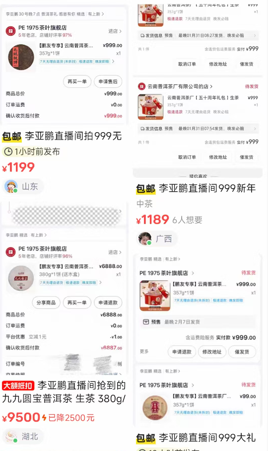 直播间火热空前,一款售价6888元的普洱茶饼,被一抢而空,卖出超700单。面对高涨的热度,李亚鹏连连呼吁网友理性下单,并将原本定于1月24日的直播延期到了1月30日。剁椒Spicy关注到,李亚鹏直播间售价“999元”“6888元”的茶叶礼盒,在闲鱼二手平台上溢价售卖,溢价最高达到2600元。